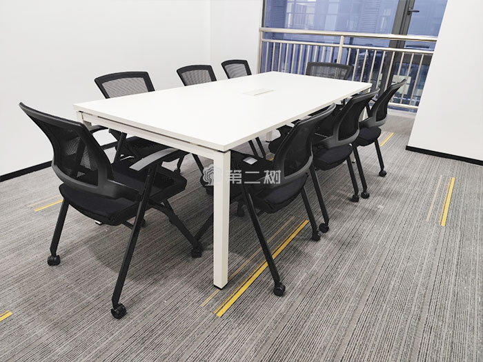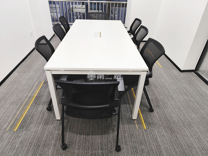 会议区选择了可满足6-8人会议需求的长条桌,搭配可移动折叠椅,灵活节省空间,方便会议室的多功能使用。