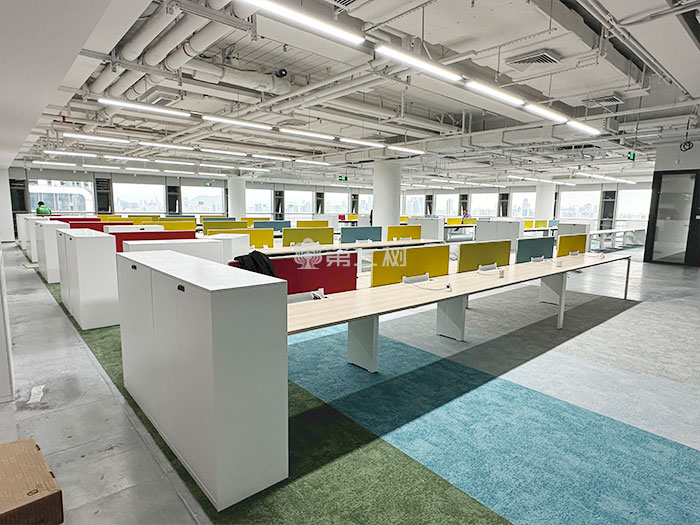 此次的办公家具主要是员工区的办公桌,采用现代简约风格的开放式办公家具组合,员工区周边采用一整排白色中柜,兼具收纳与空间隔断功能;员工工位采用简约百搭的办公工位,桌面为浅木色,搭配白色金属支架,工位间设置了红、黄、绿、蓝等多彩的彩色屏风,既划分了独立工作区域,又以明快色彩提升了空间活力感,整体布局规整有序,适配高效协作的现代办公场景。